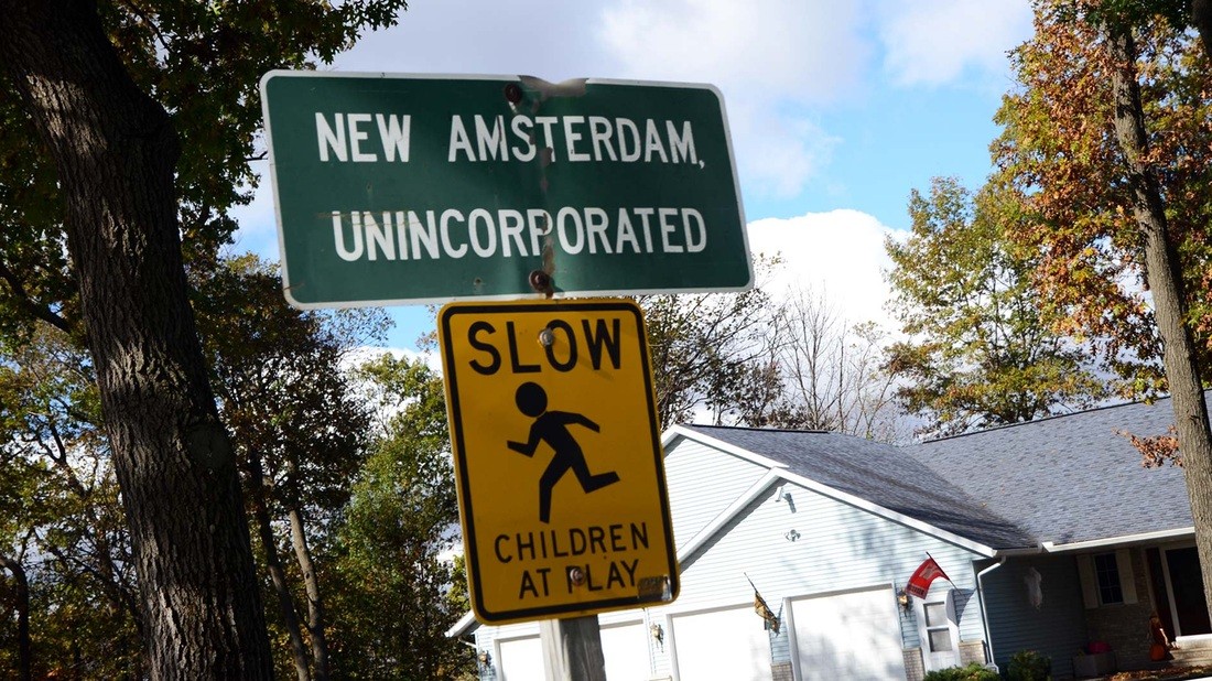 C’est Amsterdam. Ce sont quinze Amsterdam. De l’Est au Sud au Nord à l’Ouest. Quinze panneaux aux lettres blanches sur fond vert, quinze patelins perdus, d’une seule ou de deux cent cinquante âmes, rarement plus, et c’est peut-être la même chose, une ou deux cent cinquante, car il est toujours question d’âme, vieux mot que ne désavoue pas ce pays que l’on dit neuf.